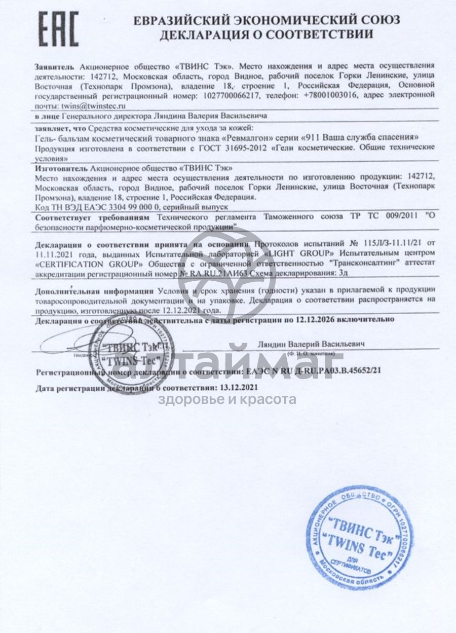 - Купите Гель для тела РЕВМАЛГОН 911 в Мурманске по доступной цене 175 ₽ с доставкой на дом или заберите Ваш заказ в Мурманске из ближайшего пункта выдачи, сделав заказ на AltaiMag.ru.