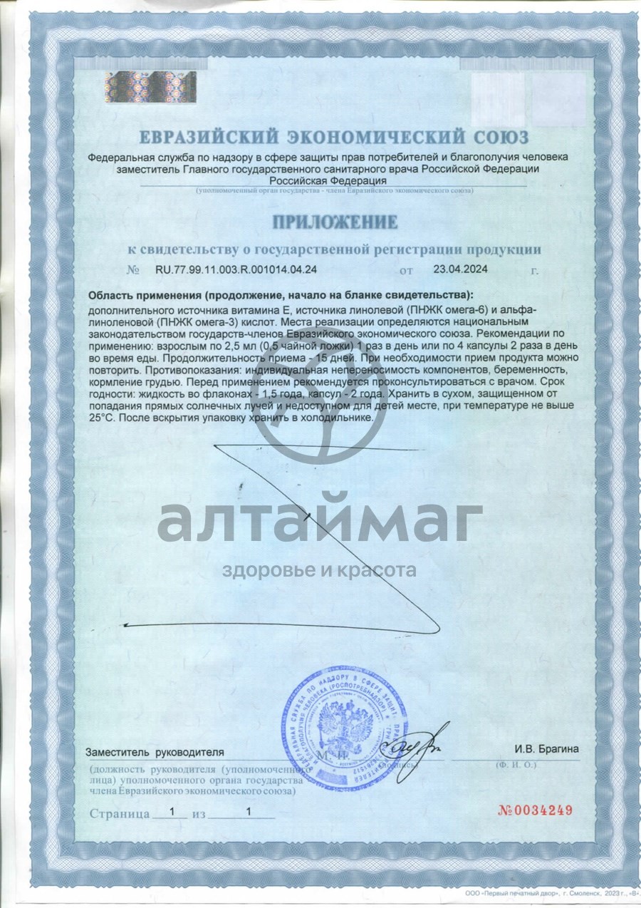 Прием внутрь через 2-3 недели значительно усиливает иммунные реакции. Показания: Дополнительный источник полиненасыщенных жирных кислот (ПНЖК) омега 3 и витамина Е.