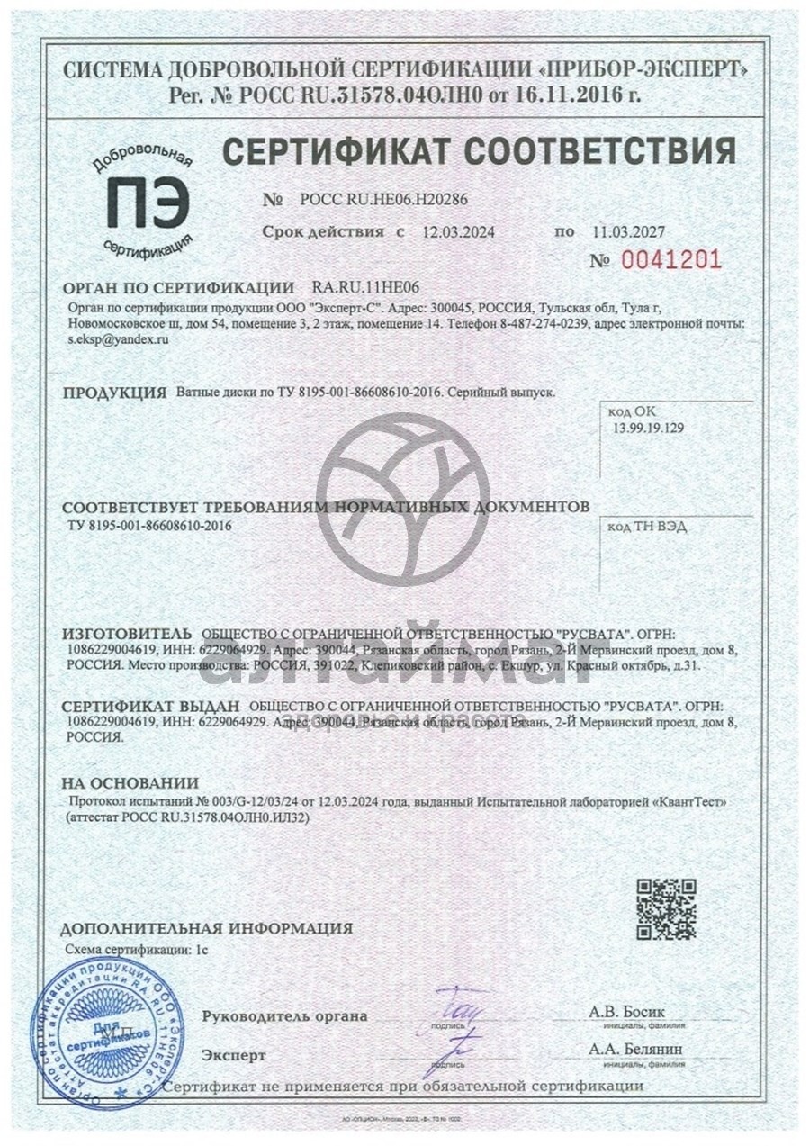Изделия санитарно-rигиенические paзoвoro использования: ватные диски. Диски из белоснежноrо хлопка, обработанного без применения хлора, нежно и бережно ухаживают за кожей, отлично впитывают влагу и косметические средства, не оставляют ворсинок, дарят ощущение чистоты и комфорта.